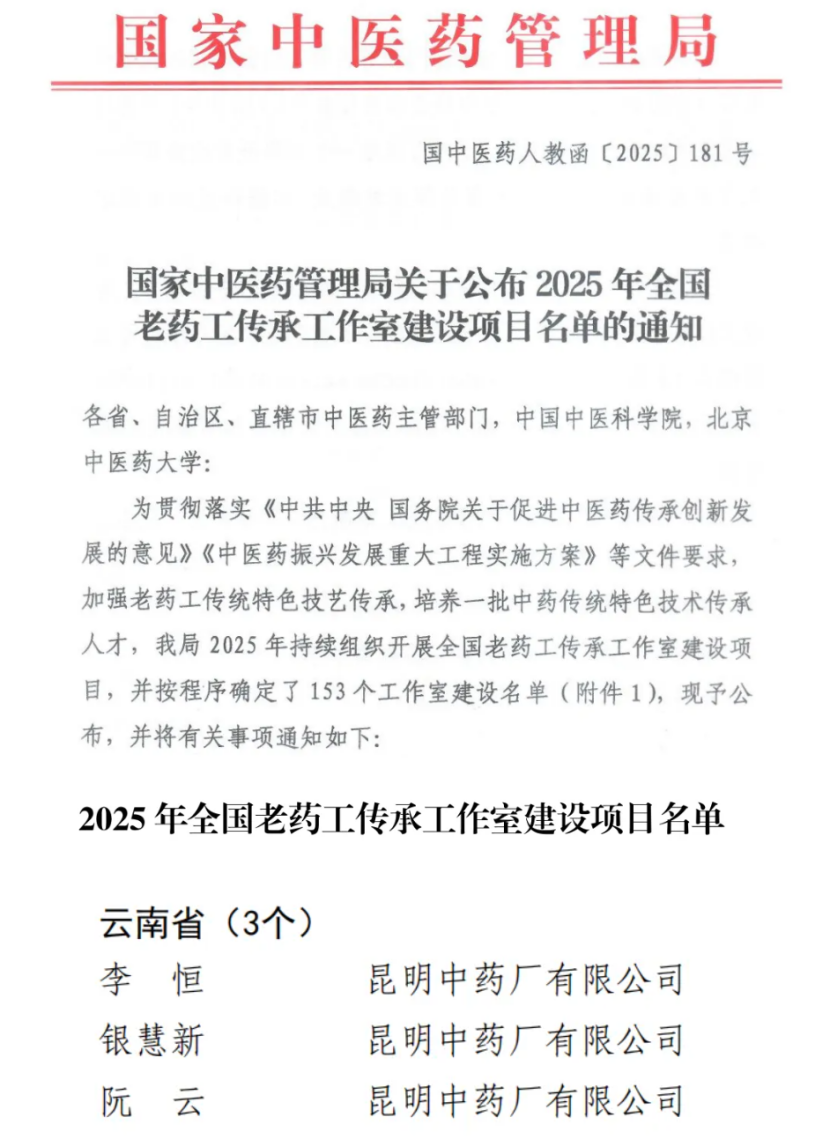 非物質(zhì)文化遺產(chǎn)是中醫(yī)藥文化的精華。2025年8月26日,國家中醫(yī)藥管理局公布第二批全國老藥工傳承工作室建設(shè)項目名單,“中華老字號”昆明中藥廠有限公司(簡稱昆中藥)李恒、銀慧新和阮云3人榜上有名。至此,...